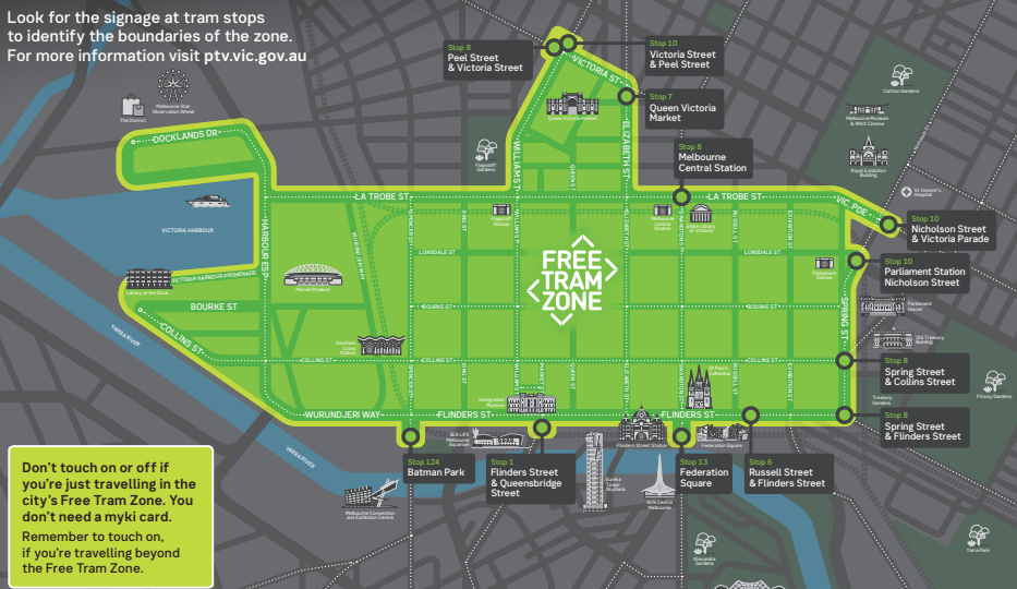 멜번 도심에서는 마이키(Myki) 교통카드를 소지하지 않아도 자유롭게 트램을 이용할 수 있는 특별한 구역이 존재합니다.